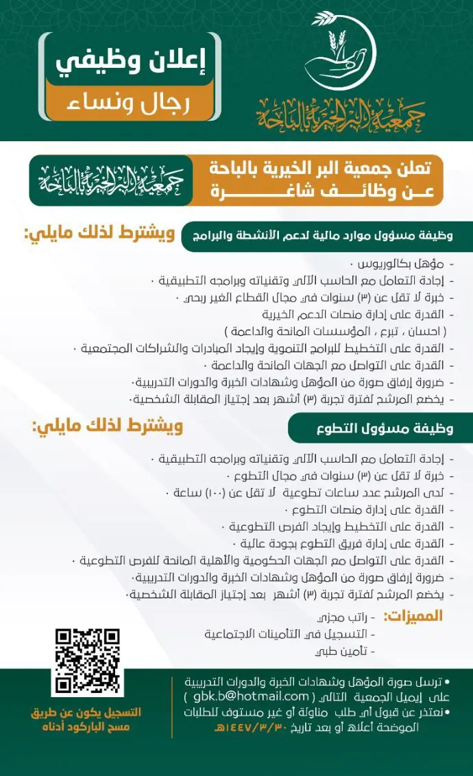 إحتياج وظيفة مسؤول موارد بشرية عبر (مسح الباركود بالصورة)